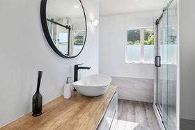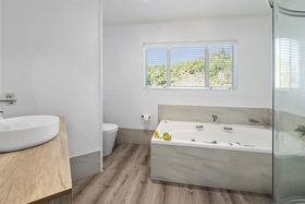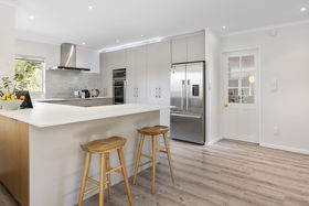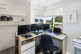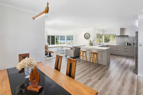 Nestled into the landscape, the home is designed with bedrooms on different levels for privacy and a main living area that includes both a formal lounge and a family space that flows seamlessly outdoors to where alfresco dining and fun family times await. The kitchen, just a few years old, is well-appointed with a double oven, induction cooktop and engineered stone benchtops.
