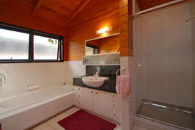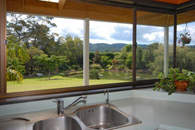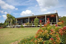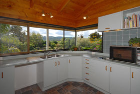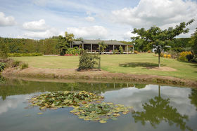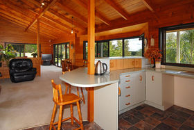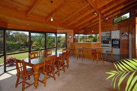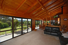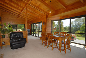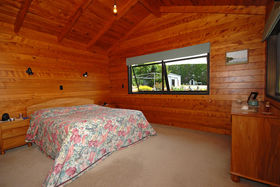 The property features a warm, north facing three bedroom contemporary home with stunning macrocarpa interiors and extensive decks set in landscaped gardens, which includes a feature lake and good farm shedding.