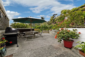 Check out the double garage and generous off street parking. Plenty of room for the campervan and/or plenty of room for visitors. A few steps down takes you to the gardens, BBQ, Spa pool area and entrance to the home.