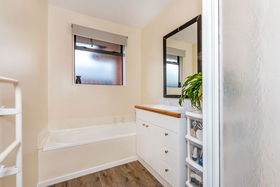 Open plan living for the kitchen/dining and lounge with outdoor access off the main living area through ranch sliding doors. The dining and kitchen are brought together by a breakfast bar and there is a heat pump for year-round comfort. Recessed lighting and new carpet throughout and easy clean vinyl planking in the kitchen and bathroom. There are two bedrooms with one having floor to ceiling windows and there is a family bathroom with a separate bathtub and shower for options as well a separate toilet.