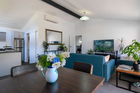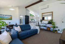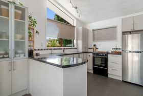 Built in the 1970s, the enduring brick single level home has a light and modern interior with extra height raked ceilings injecting that all important spaciousness. An open plan living room with dining area has heat pump and sliders leading out to a sunny north/west facing deck, flat fenced lawns, and lush tropical gardens. The perfect place to throw down the bean bags contentedly enjoying a cool drink with a good book. The modern kitchen is open plan for ease of socializing and has a trendy monochromatic colour scheme with bold black countertops and cooker surrounded by plentiful cabinetry. Both bedrooms are well served by a separate toilet, tidy bathroom with wet shower and a separate laundry accessed from the tandem carport. Space also for boat or trailer.