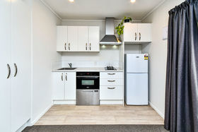 * Functional kitchen with single drawer dishwasher, under-bench oven, and 2-burner gas hob.