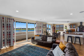 Open plan kitchen, dining and lounge upstairs with pleasant river outlook
