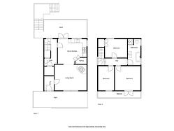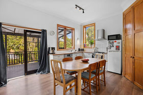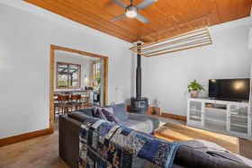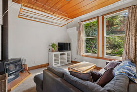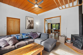 There's off-street parking at the street front, with a path leading down to the house. Step inside and the living room immediately feels inviting. The feature timber ceiling adds character, while a Metro wood burner and heat pump ensure the space is warm. The adjoining modern kitchen and dining area flow easily, creating a great place to cook, chat and unwind together. French doors open to a covered deck, the perfect spot for year-round entertaining or relaxing outdoors. The rear section stretches out below, providing ample room for kids to run and play.